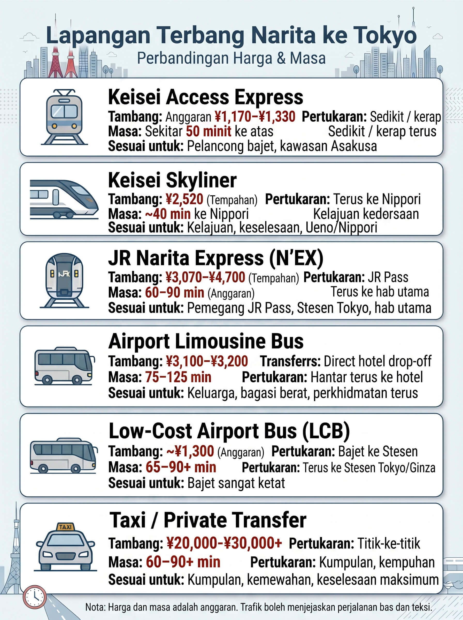 Bahagian ini sesuai untuk anda masukkan gambar perbandingan supaya perbezaan antara pilihan utama dapat dilihat dengan cepat. Secara umum, Access Express ialah pilihan rel yang paling murah dan praktikal untuk ramai pelancong, Skyliner ialah pilihan paling pantas ke Ueno dan Nippori, N’EX ialah kereta api terus paling mudah ke hab JR utama, manakala perkhidmatan bas selalunya paling praktikal jika anda mahu mengurangkan pertukaran atau membawa beberapa beg besar. Source Source Source Source
